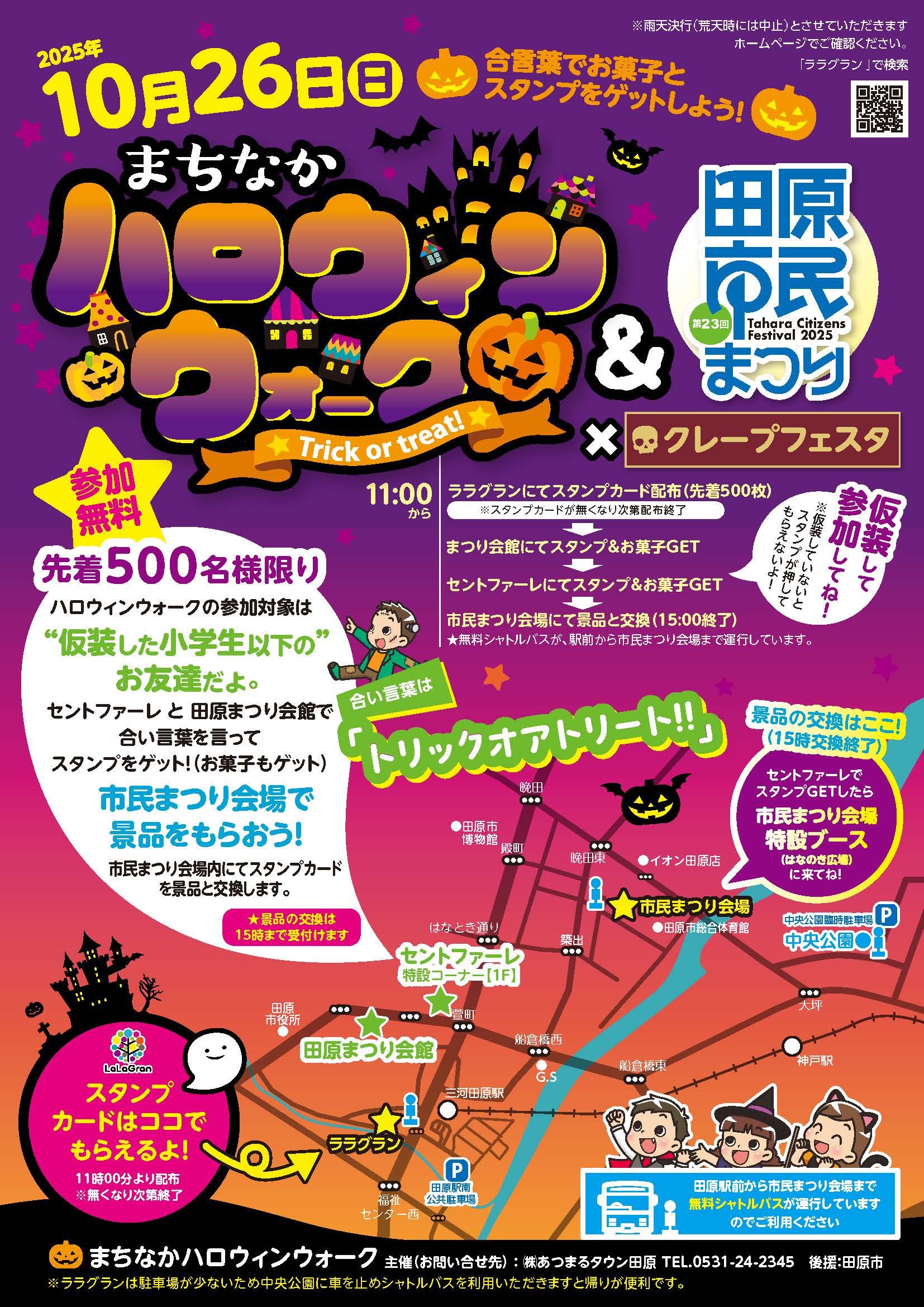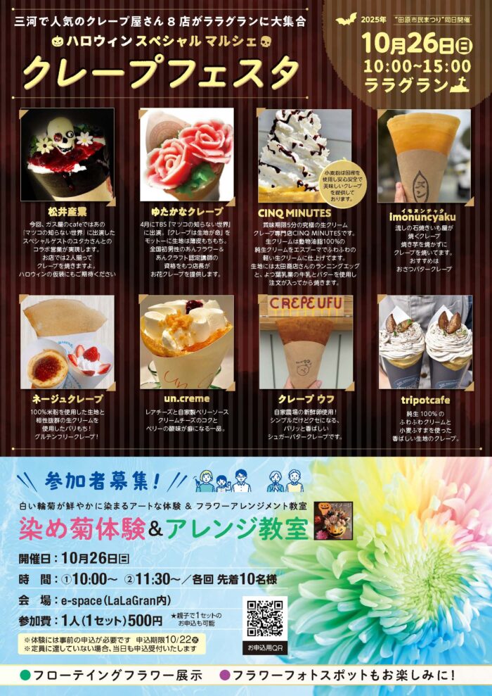 ハロウィンイベント&クレープフェスタ 今年も開催 2025/10/03 10月26日(日) 11:00~15:00 ハロウィンイベントを開催します。 クレープフェスタ&花イベントも同日開催 10:00~15:00 共有:Facebook で共有するにはクリックしてください (新しいウィンドウで開きます)クリックして Twitter で共有 (新しいウィンドウで開きます)